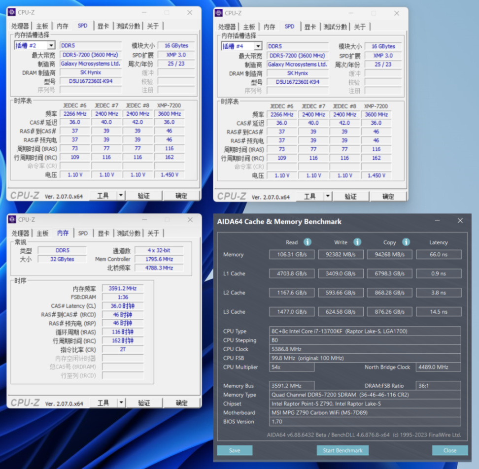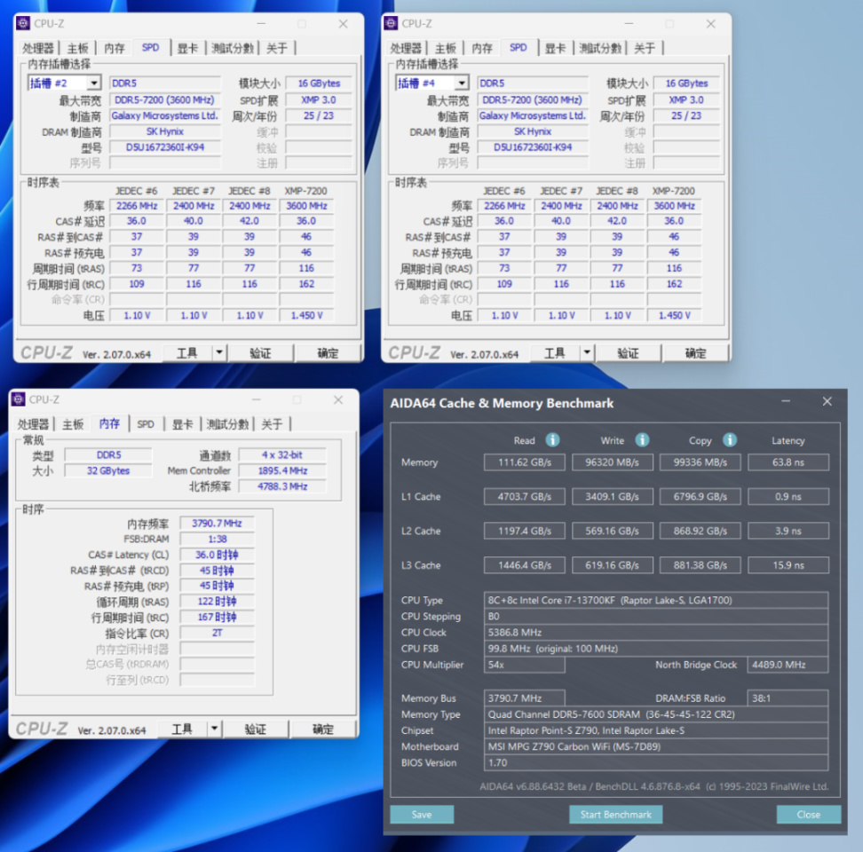 主板最高可支持OC至7600MHz+的内存频率和192GB的内存容量,容量咱肯定拉不满,但是频率方面,咱今天的规格也得跟上。影驰名人堂HOF Pro D5-7200MHz 16G*2内存安排。