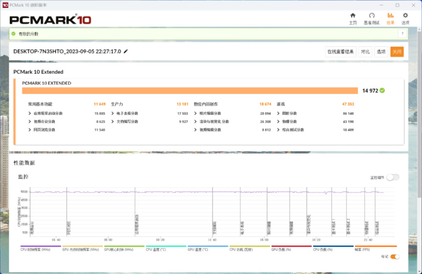 PC Mark Extended整机测试,整机得分14972分,常用基本功能得分11649分,生产力得分13181分,数为内容创作得分18674分,游戏得分47353分;
