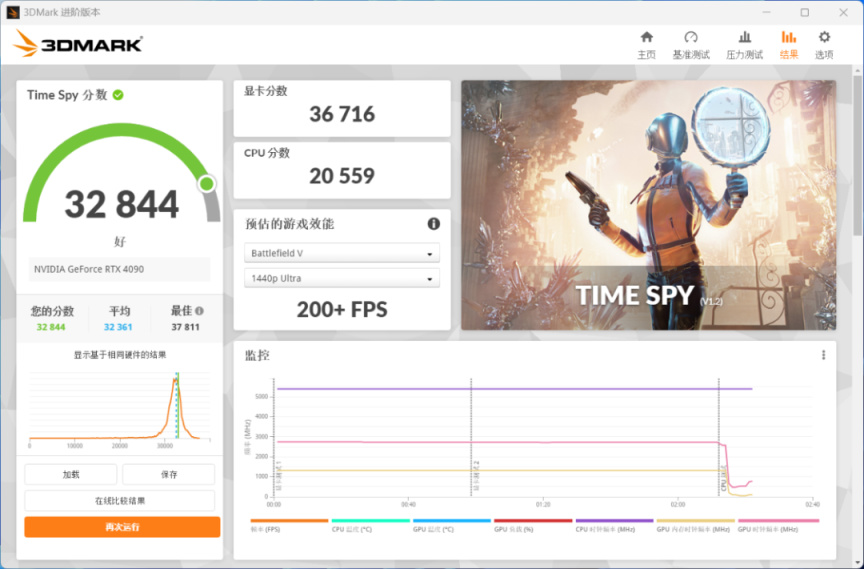Time Spy基准测试,CPU得分20559分,显卡得分36716分;