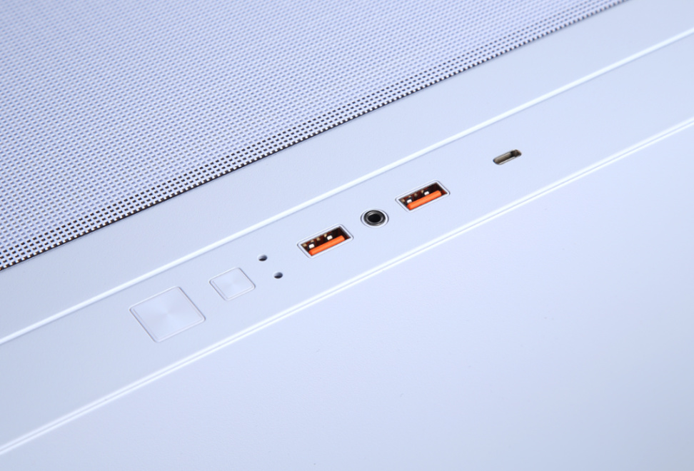 I/O面板位于机箱顶部,含USB 3.0*2、USB 3.2 Gen2 Type-C*1、二合一音频口和一组开关机/重启按钮。