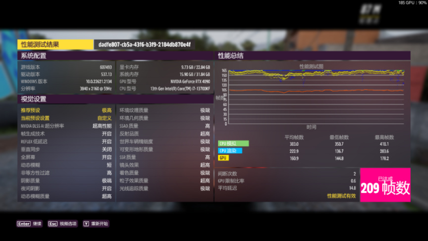 《极限竞速·地平线5》基准测试,极端画质,极端光追,DLSS超级性能,并开启DLSS 3.0,4K分辨率下,游戏平均帧率209FPS。