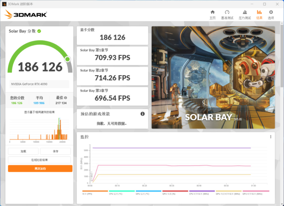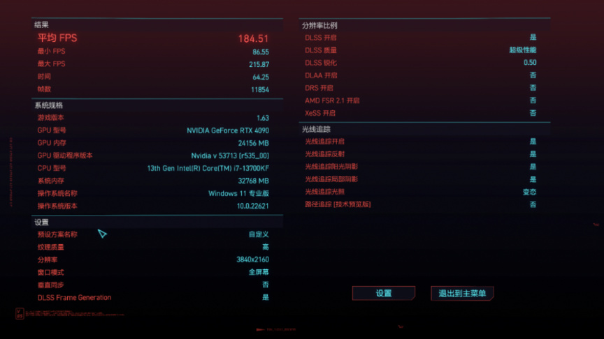 《赛博朋克2077》基准测试,画质超级,光追超级,DLSS设为超级性能模式,并开启DLSS 3.0,4K分辨率下,游戏平均帧率为184.51 FPS;