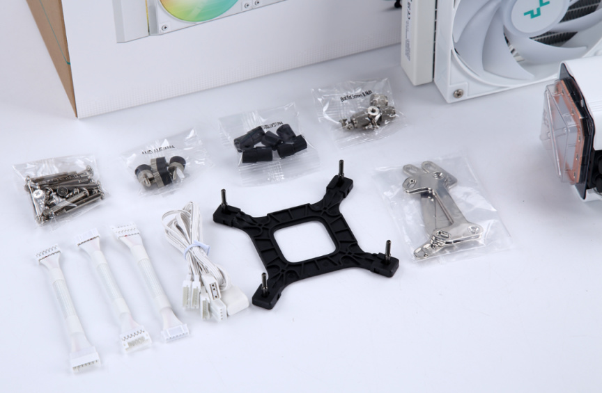 先给配件来个全家福,Intel与AMD双平台扣具必须全安排上。此外,还配备了3根7pin风扇降速线以及一根7pin接口的3合1风扇转接线。