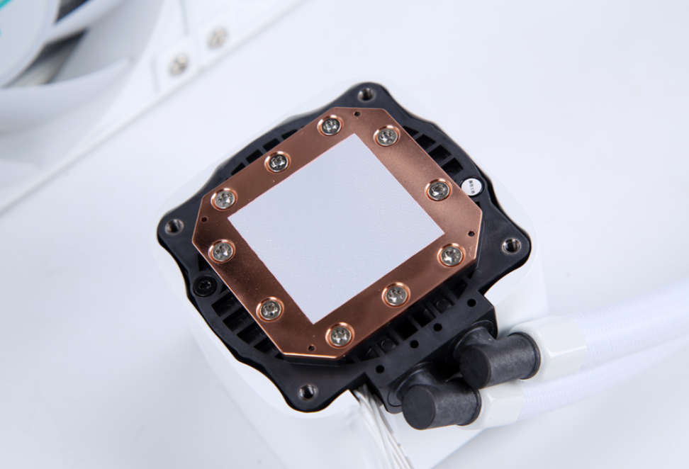 冷头采用大面积精雕紫铜底座,内置九州自研的第4代高性能水泵,高转速三相内绕马达,最高可达到3100RPM的转速,搭配上低噪音陶瓷轴承和全新的内部微水道设计,大幅提高了整个水冷的散热效率。预涂硅脂的设计,对于玩家来讲,非常省心。