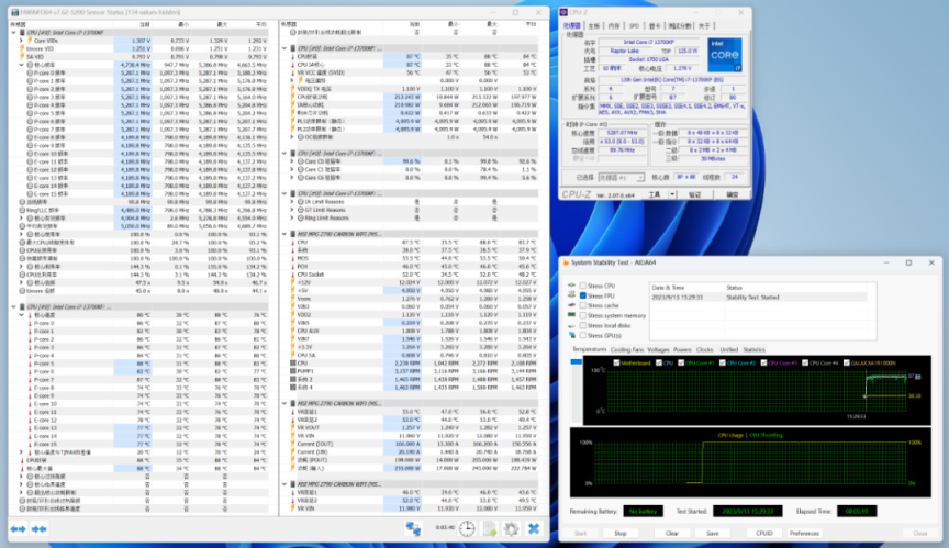 单烤FPU测试,自动睿频拉满状态下13700KF封装温度稳定在87°左右。