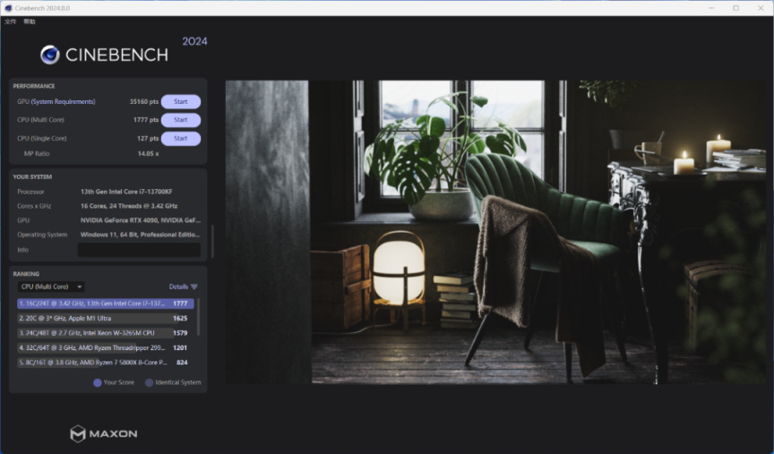 CineBench 2024基准测试,单核得分127pts,多核得分1777pts,显卡得分35160pts;