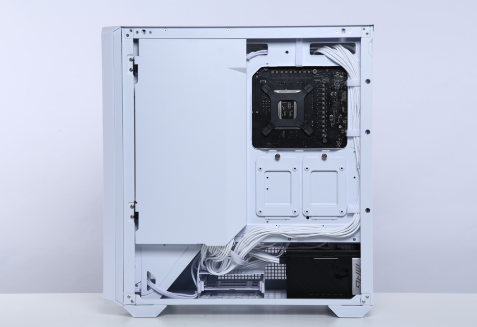 机箱背线空间充沛,还提供了一块可拆卸式磁吸遮线挡板,并配置了一块便于走线的理线导轨,搭配上机箱配件盒中的理线卡扣,大大降低了背线的难度;