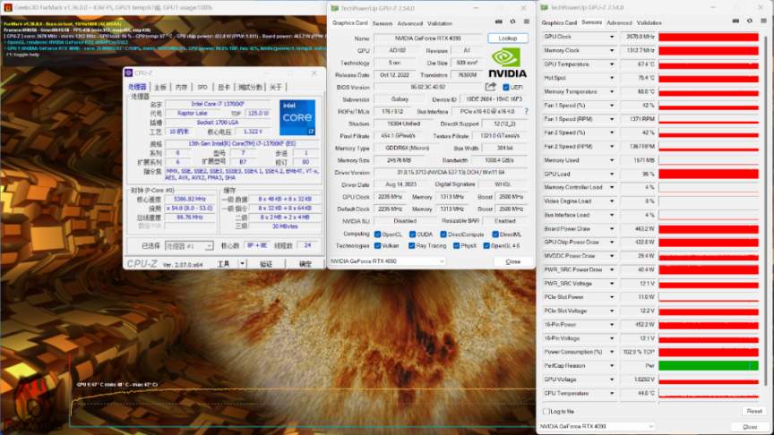 FurMark烤机测试,机箱内环境,烤机15分钟显卡温度为67°左右,显卡功耗为460W左右;