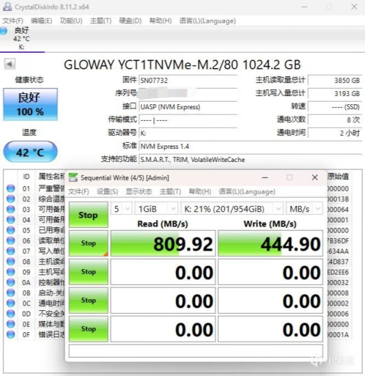 ▼最后是散热测试,简单跑个读写测试,室温22℃左右,固态硬盘的温度稳定在41℃左右,跑测试的时候略微高一点点,在42℃左右。