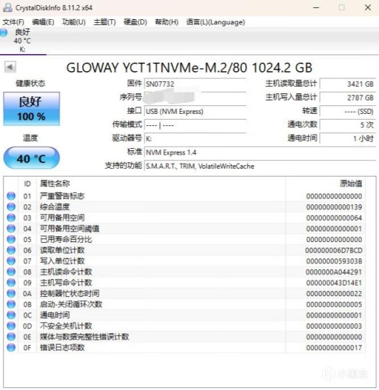 ▼简单看下固态硬盘的参数,通电次数5次,通电时间1小时,全新的无疑。读取和写入是跑完测试之后想起来了,然后又截的图。