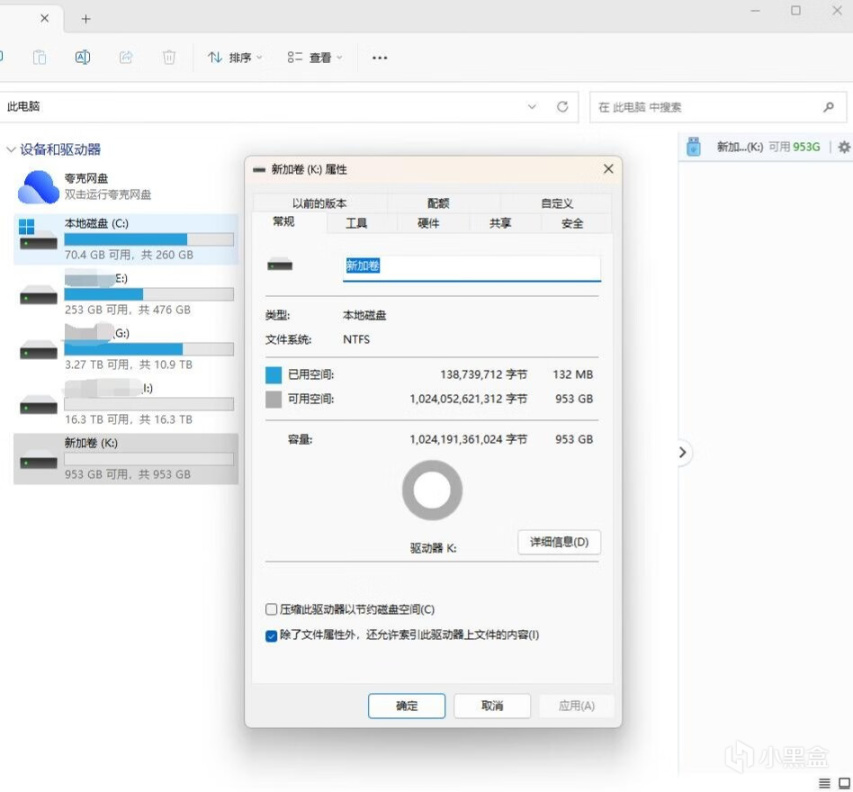▼简单看下容量,固态硬盘标称容量1TB,实际可用在953GB左右。