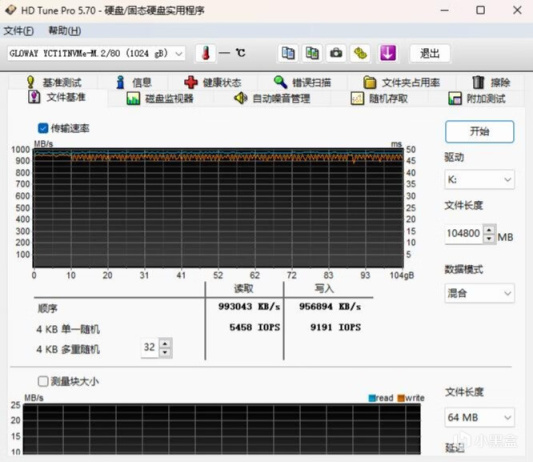 ▼跑个完整测试,4K读取速度38MB/s、写入57MB/s,这个4K性能还不错,可以跑点软件之类的,也没啥问题。