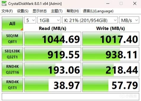 ▼跑个DiskMark测试,顺序读取速度1044MB/s、写入1016MB/s,速度表现也非常不错,超过了1000MB/s。
