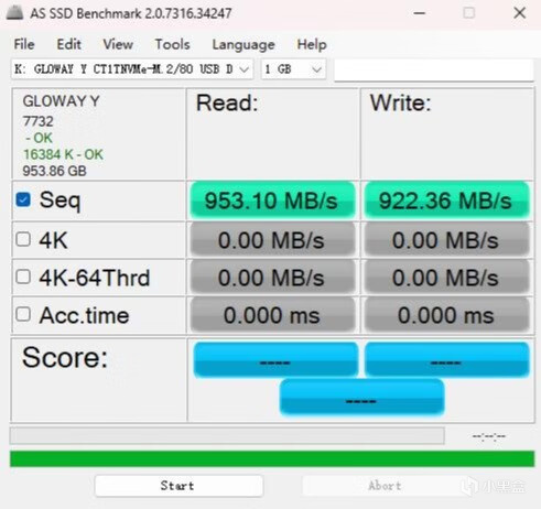 ▼简单跑个AS SSD的读写测试,顺序读取速度953MB/s、写入速度922MB/s。