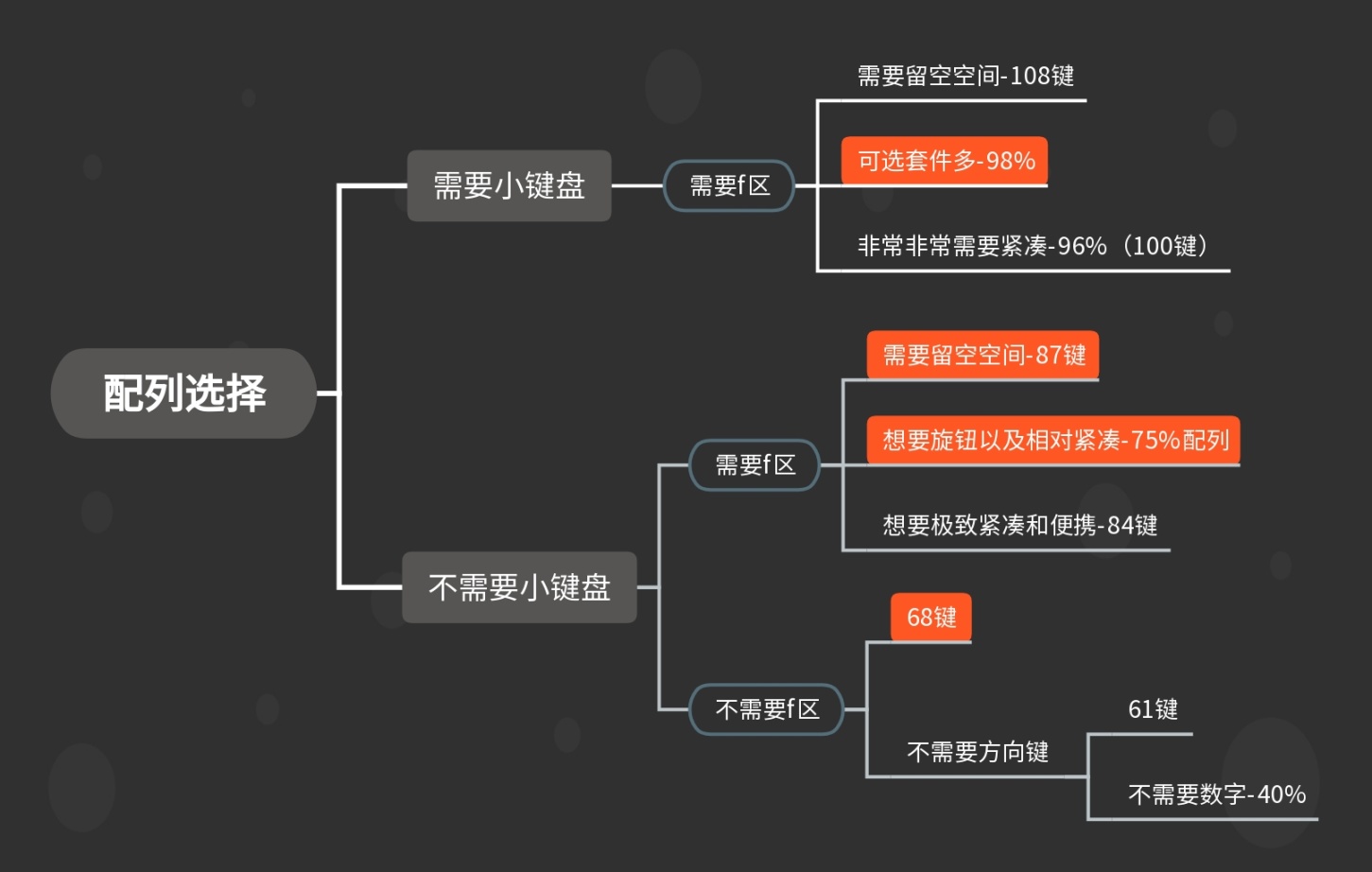 个人来说套件的选择要先确定自己的需求,例如需不需要f区(f1f2这些按键)需不需要数字小键盘等,其次再考虑键盘套件的售价即可,一般同配列键盘不同价位差距更多在做工细节和功能上,使用方面不会有很大的差别(不会说哪个键盘打游戏会卡)。