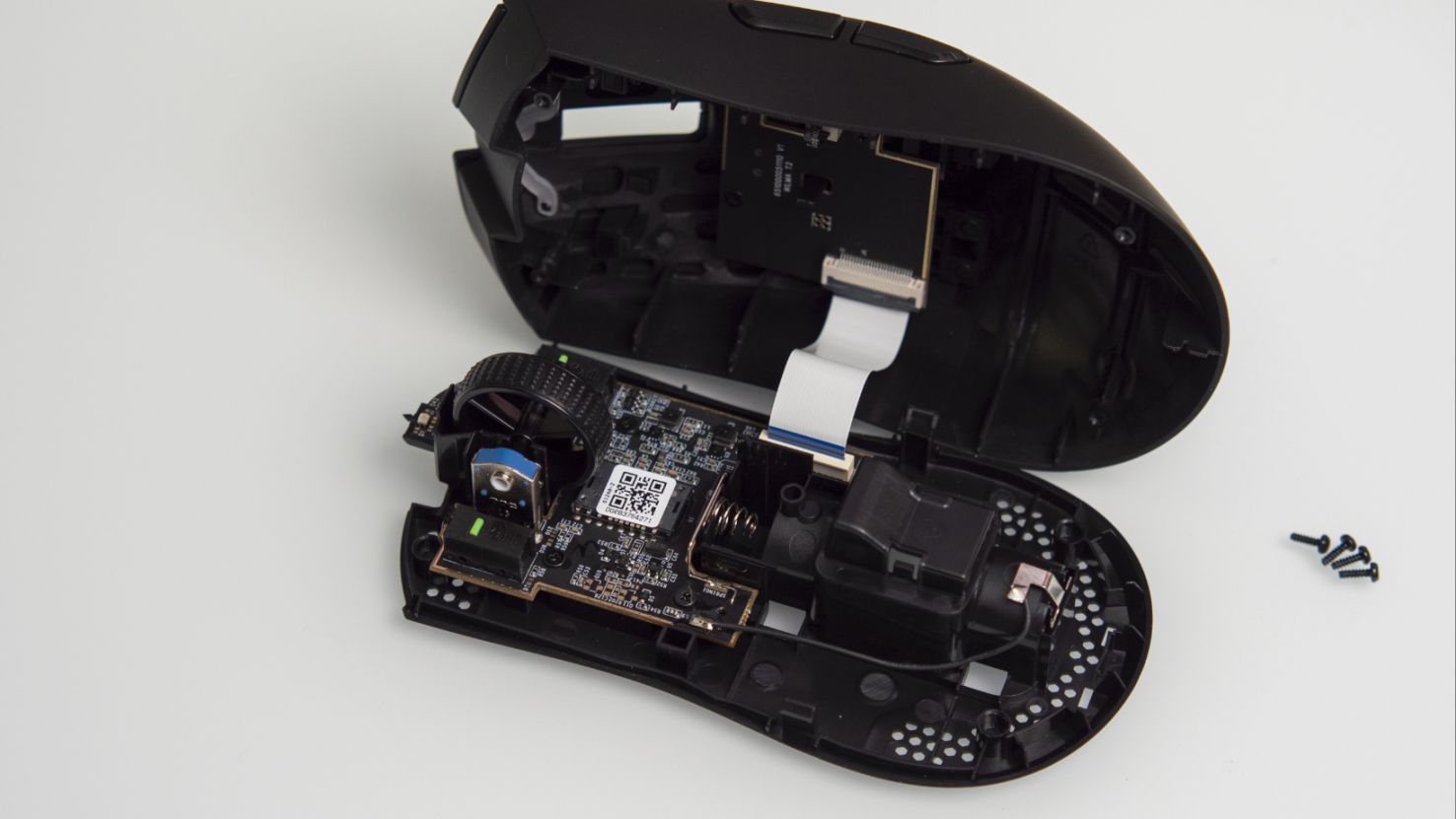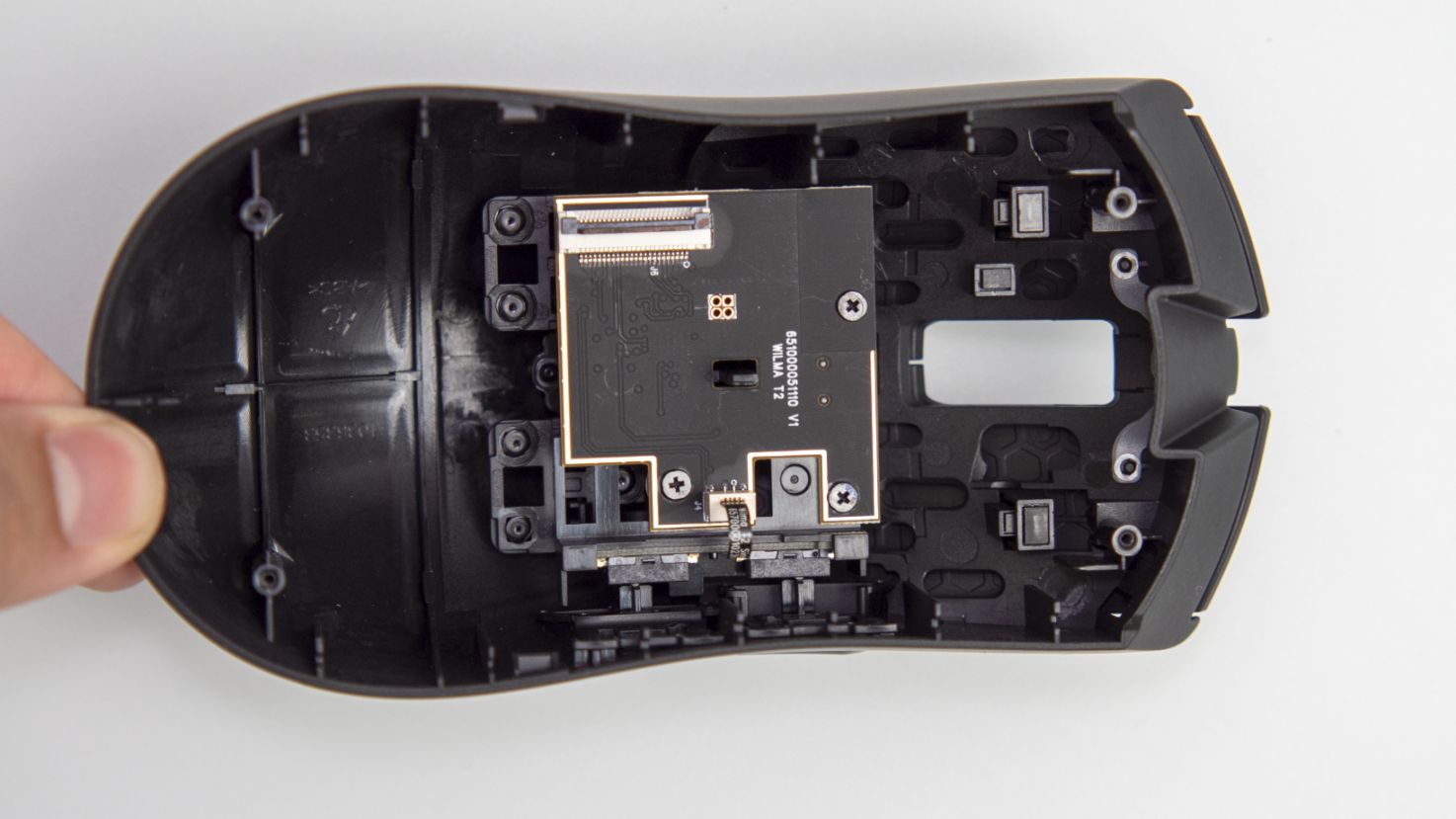 最后来看鼠标拆解,撕开底部脚贴拧下四颗螺丝即可打开鼠标。
