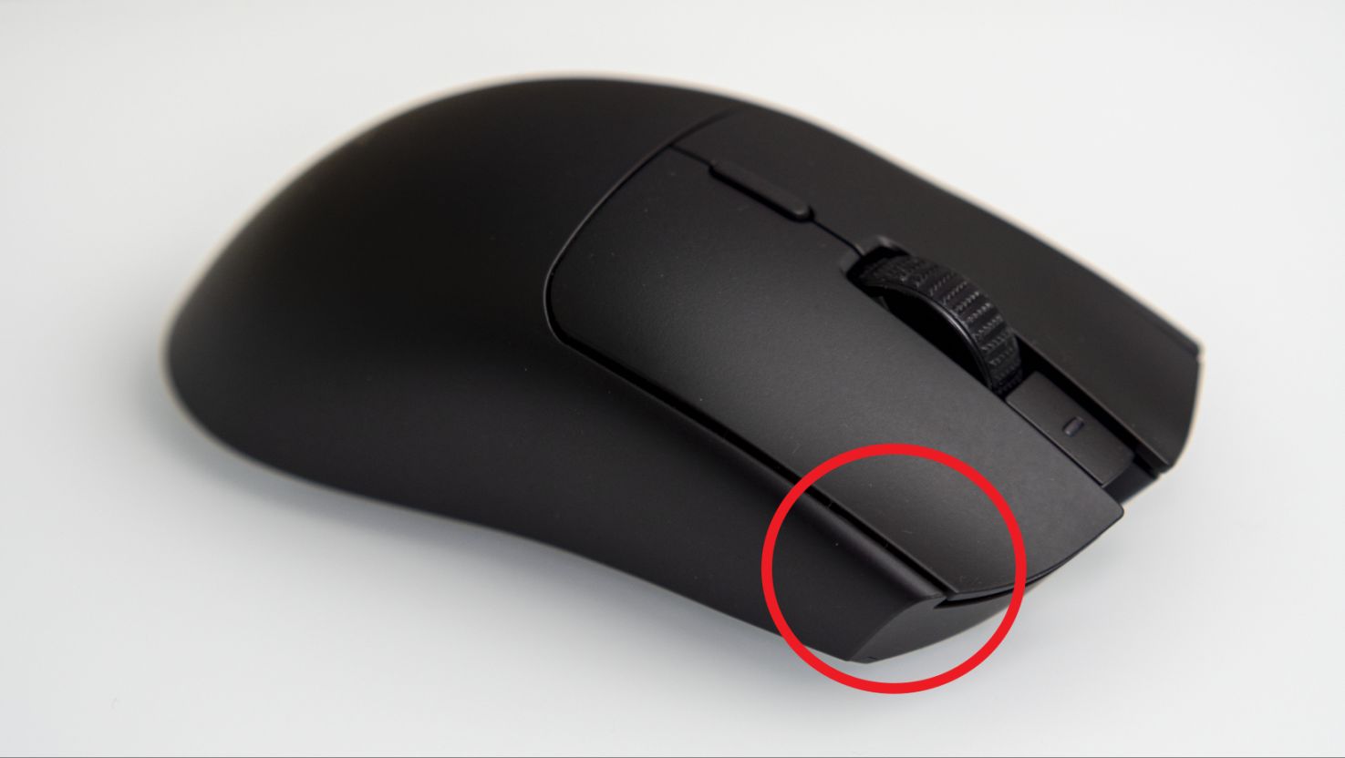 侧裙两侧的高度抬升到和左右键保持一致,并添加了包边设计。这样在握持和点击时,就不会出现想毒蝰V2Pro那样夹到无名指的情况。