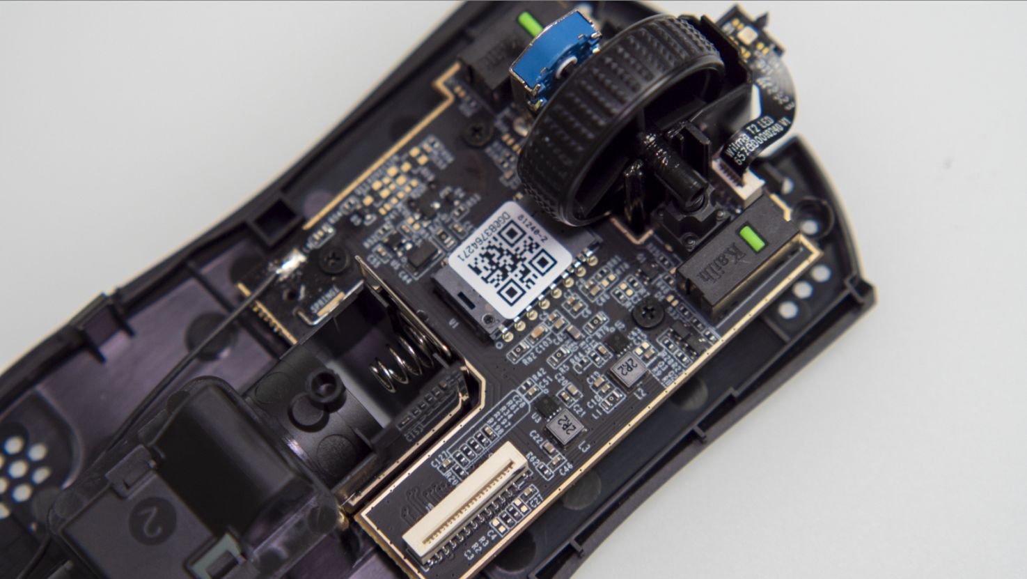 电池供电线直接焊接在主板上,左右键微动采用凯华绿点机械微动,6000W次寿命,手感硬脆。