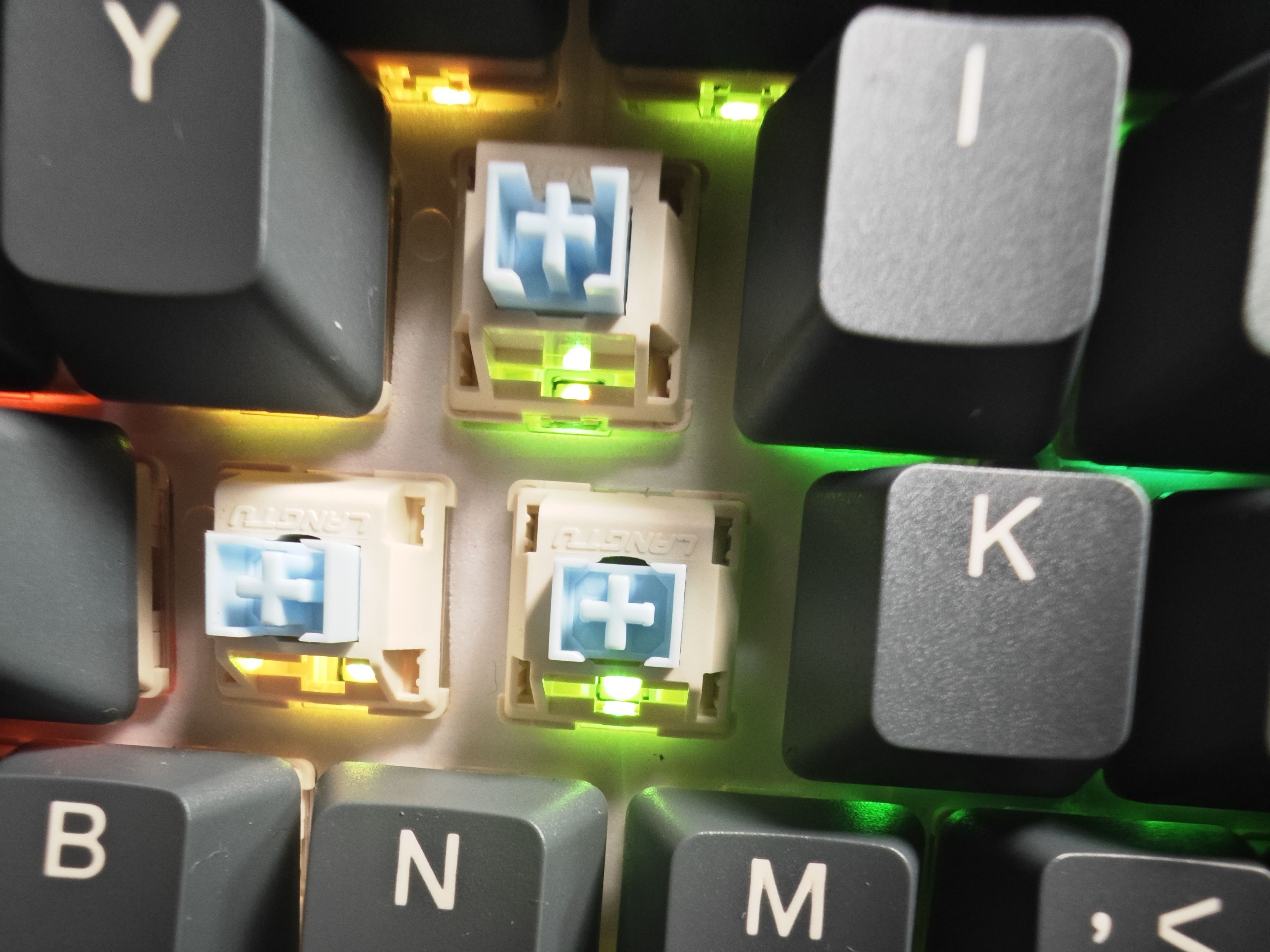 当然LT104夏初是带灯的机械键盘,1680万种RGB灯光色彩,不使用驱动默认有20多种不同的灯光特效可选择。两侧还有灯带,在暗环境下氛围感十足。灯光虽然很炫彩,但是不闪屏,不会给人那种赛博精神小伙的感觉。