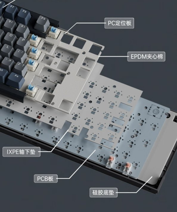 LT104夏初整体结构采用三明治结构,能够很好的抑制底部震动。快速打字时候可以有效减少震动,让整个键盘非常稳,同时还能减少噪音。
