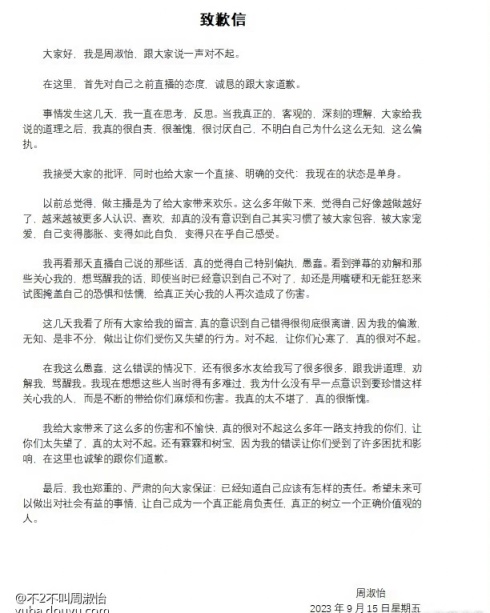 周淑怡发长文道歉,并且在直播中正式宣布自己是单身!