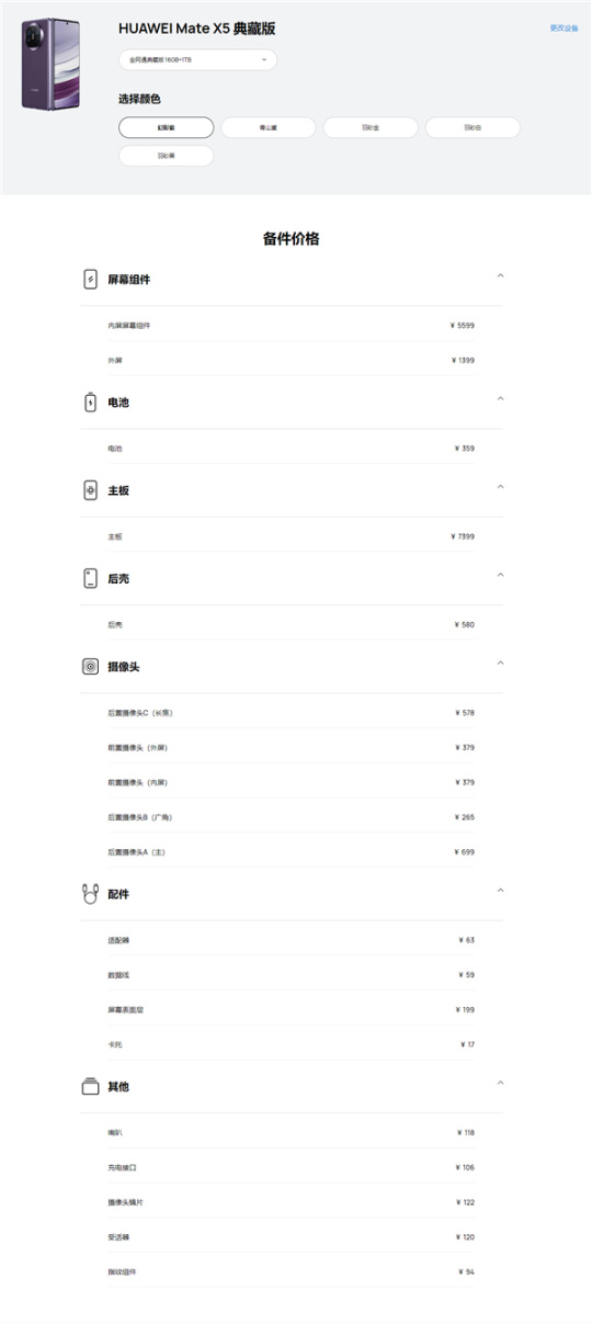 华为Mate X5典藏版(16GB+1TB)内屏5599元、外屏1399元、主板7399元,其他像电池、镜头等与Mate X5标准版一致。