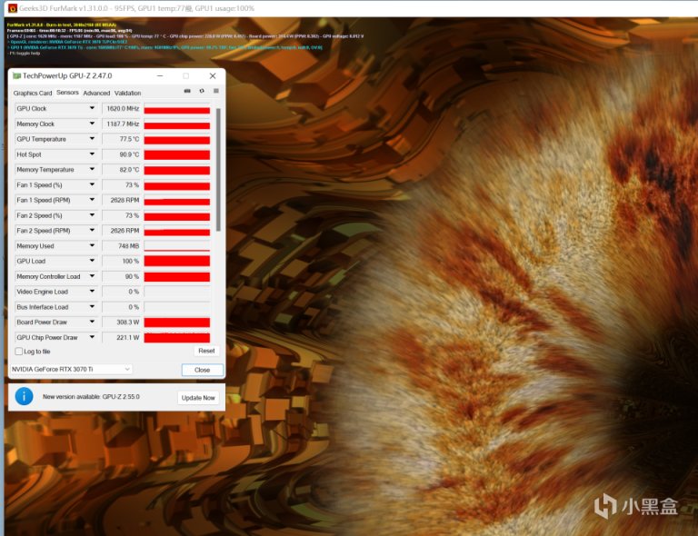 显卡方面,在双烤模式下RTX3070Ti显卡的功率为308W,但得益于超频三星界 C3 T500机箱的底部预留了散热孔,拷机10多分钟,最高温度仅为77.5℃。