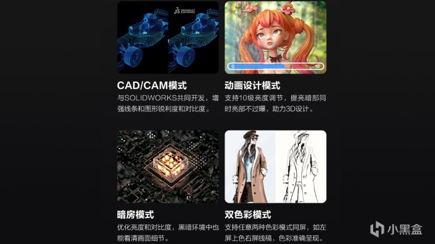 当然了,除了出色的屏幕之外,明基PD2705U还内置了CAD/CAM模式、动画设计模式、暗房模式及双色彩模式。这四大专业设计模式,基本上涵盖了小伙伴们日常使用的所有场景。