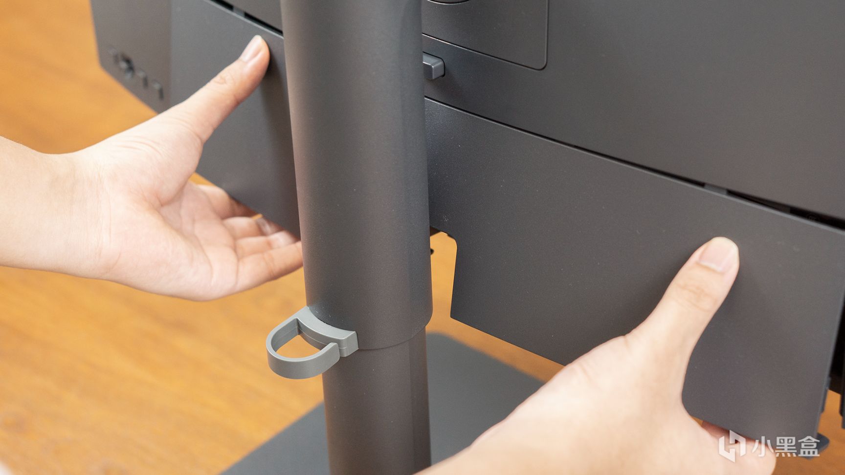 将支架与显示器背面的卡扣对准,轻轻一压即可。