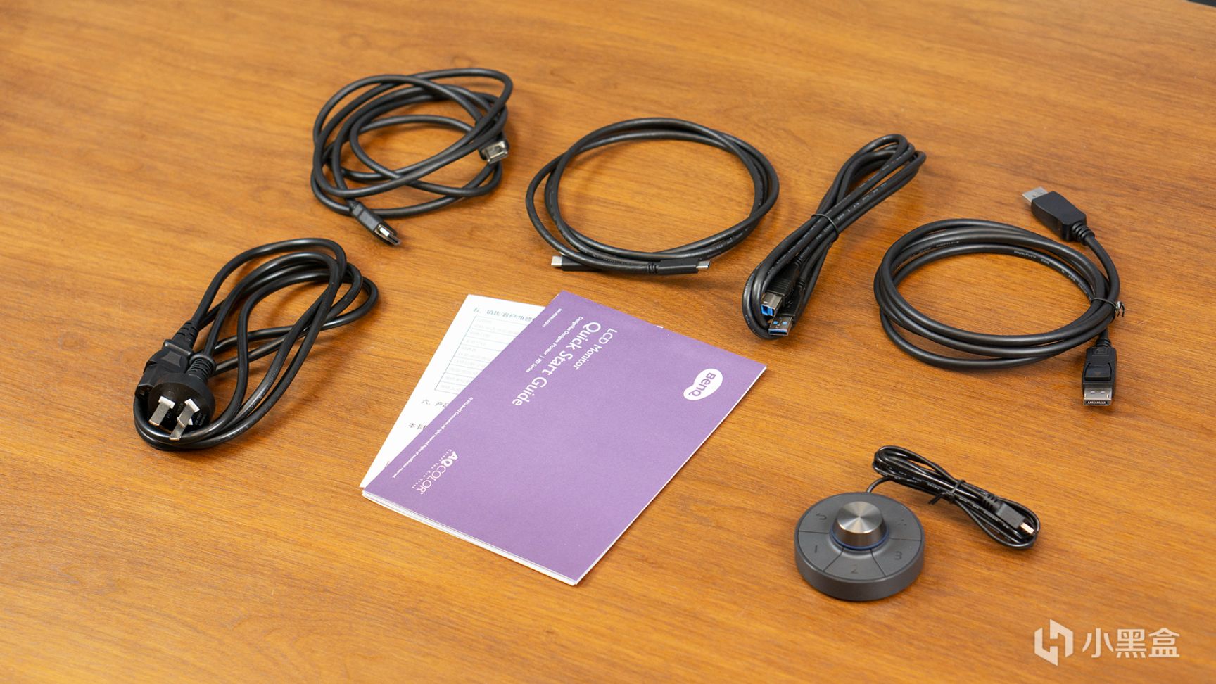 从上到下、从左到右分别是HDMI线、TYPE-C线、USB-B to USB-A线、DP线、电源线、说明书及纸质文档、Hotkey Puck G2控制器。