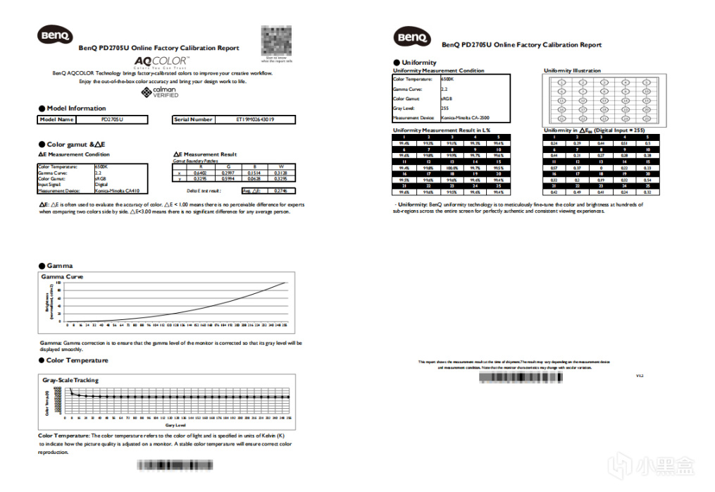 更详细的色彩及亮度信息,我们可以看一下出厂测量的结果。