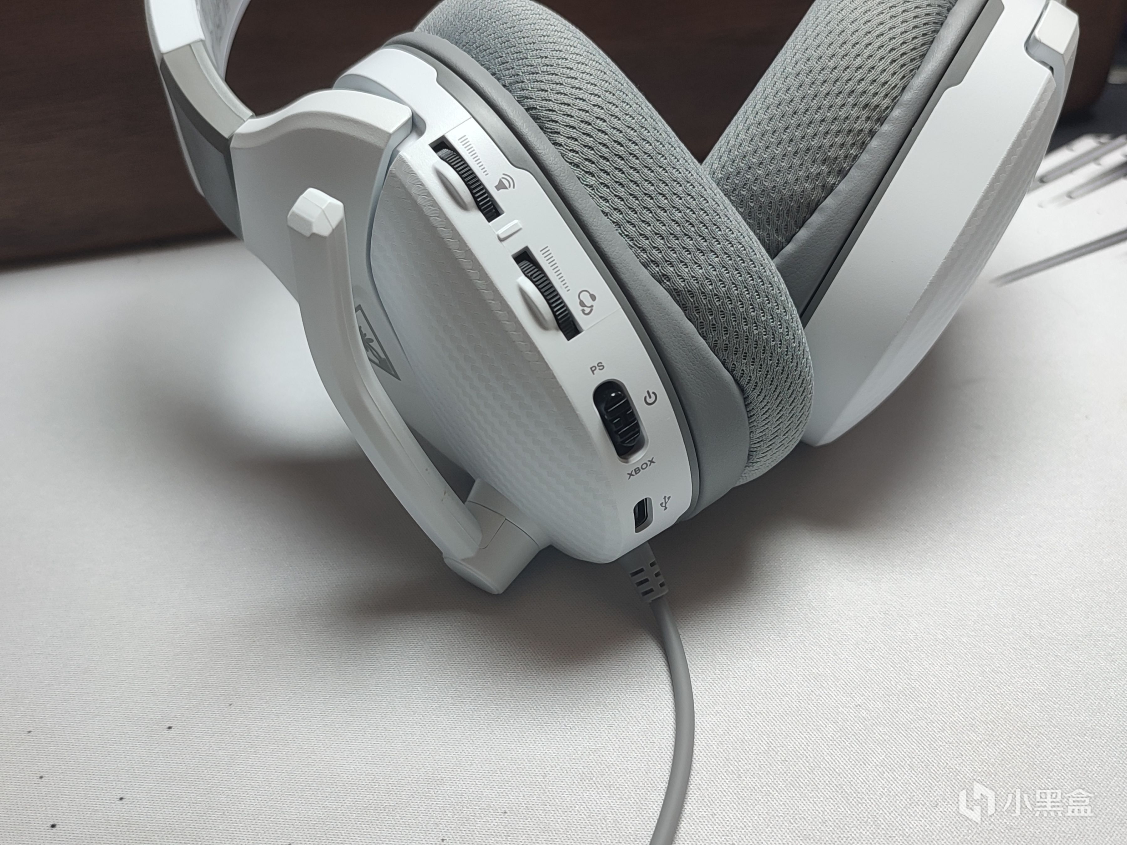 耳机的所有功能键包括线材位置都做到了耳机的左侧,从上到下依次是“音量调节”、“麦克风监听”、“PS/XBOX模式”以及“Type-C充电口”,前面几个都很好理解,但是最后一个肯定会有人疑惑,这不是个有线耳机吗,怎么还配备了一个充电口,这就是斥候200的独特的功能,充电后可以额外提供低音加强,无论是什么使用场景下都能增强低音,可能唯一缺点就是续航不是很久,充满电后也只能提供约12小时的低音加强功能。
