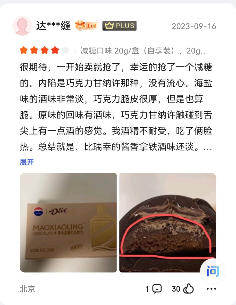據評論區搶到的用戶評價:內餡不流心,酒味比較淡。巧克力偏苦。