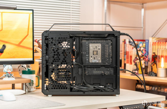 机箱的内部结构,主板位内部有多处镂空,右侧的电源罩上也有机械大师的logo