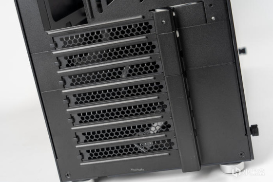 PCIE挡板的第二三槽位可以拆下,上半部分下移两格,顶部安装配件中的挡板,使得机箱结构变为MATX,这可以让顶部获得更大的空间和支持更厚的冷排;并且中间的二三槽和下面的四槽可横向安装支持显卡竖装