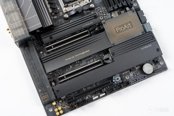 打开两片M.2散热片,其中第一条和第二条支持PCIE5.0 M.2 SSD,第三条和第四条支持PCIE4.0 M.2 SSD,另第一条支持全长110mmSSD,所以M.2都支持M.2 Q-Latch 便捷卡扣