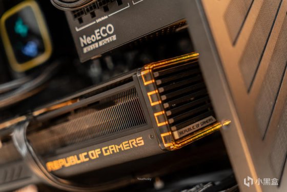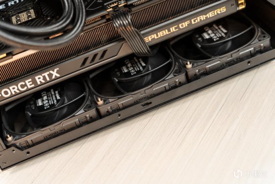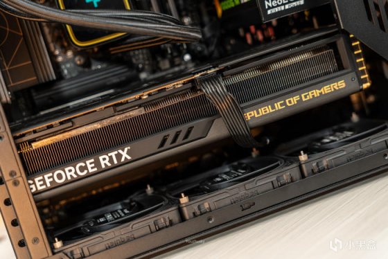 低调的玩家国度 ROG STRIX GeForce RTX 4090-O24G -GAMING 猛禽显卡,只是顶部这里基本用于散热,只有GEFORCE RTX点缀和带ARGB效果的“REPUBLIC OF GAMERS”