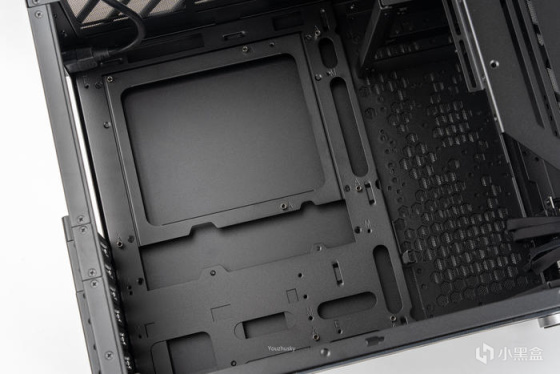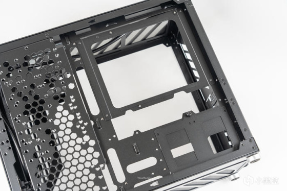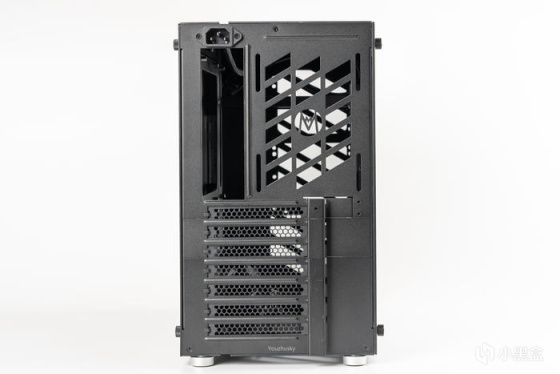 背板左侧的镂空结构主要设计用于硬盘架和电源安装以及风扇通风安装