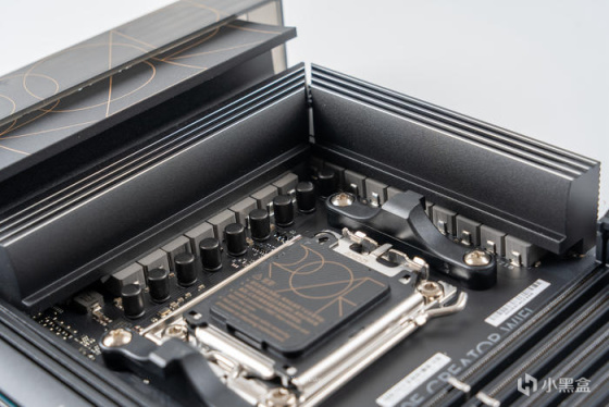 主板的全貌,黑底金字有种贵族气息的设计,特别是配合磨砂半透的IO与声卡覆盖设计