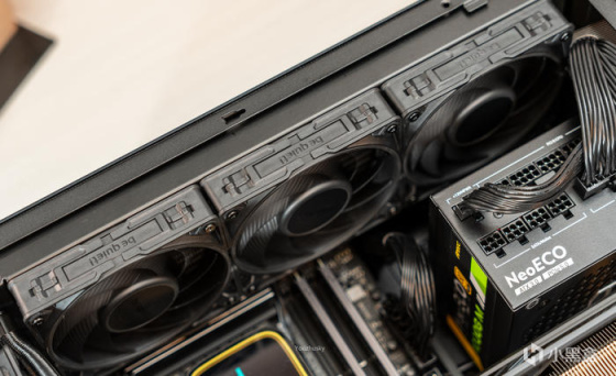 底部三把,顶部三把,后置出风口一把,共7把德商德静界 SILENT WINGS PRO 4,并设置在最低1600RPM的M档,使得整机噪音不会特别大