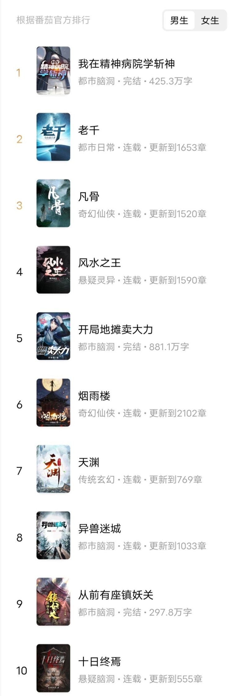 今天给大家带来番茄小说APP内男生口碑前十的小说。小说质量肯定是没问题,希望各位友友喜欢。附排行省流图片👇🏻