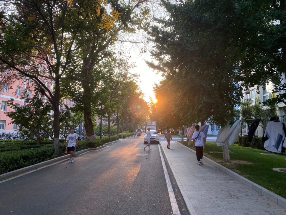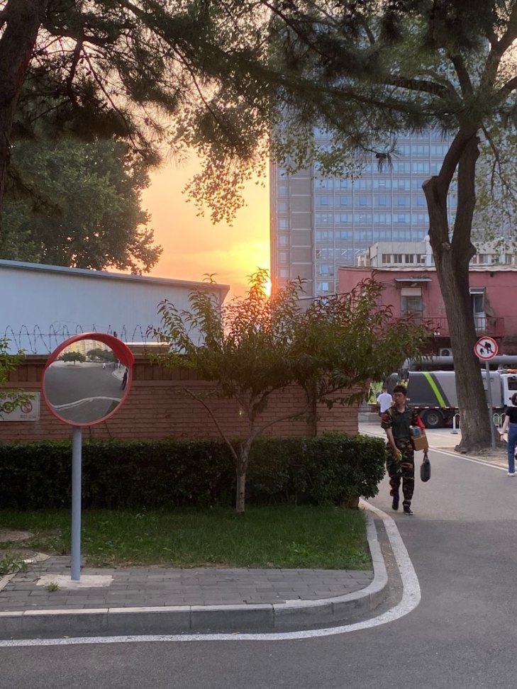 外卖放在南门,我走在一条正西方向的路上,道沿两排树展开枝叶,落日就这样正正好挂在树冠,藏在树梢里。我好像走在一条朝圣的道路上,又或者是一条加冕之路。