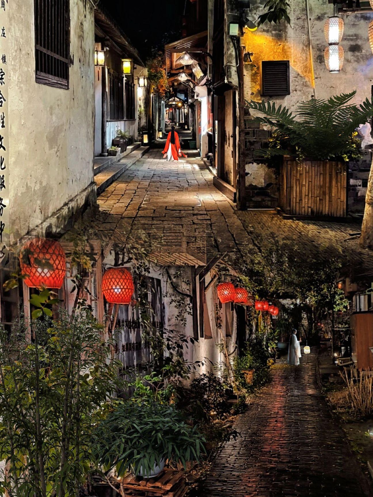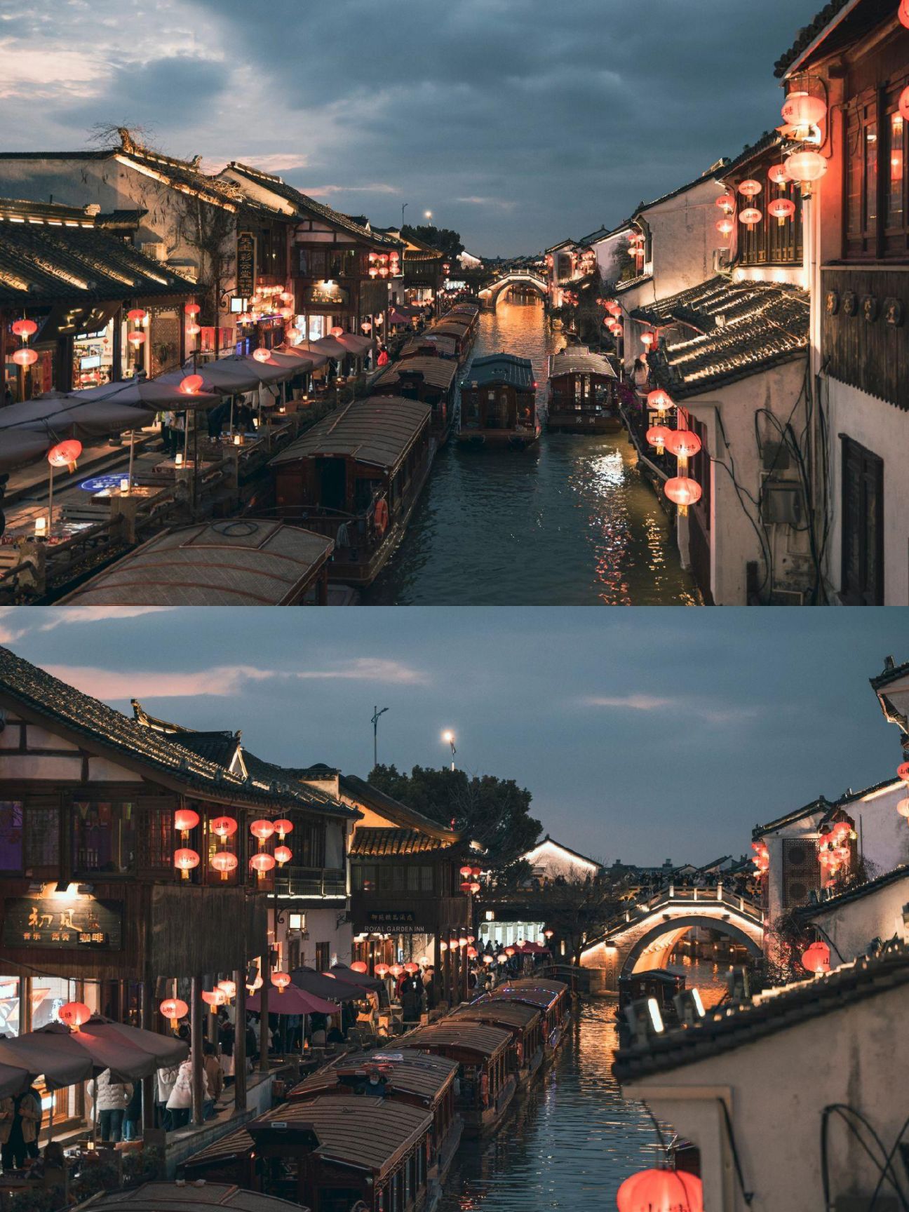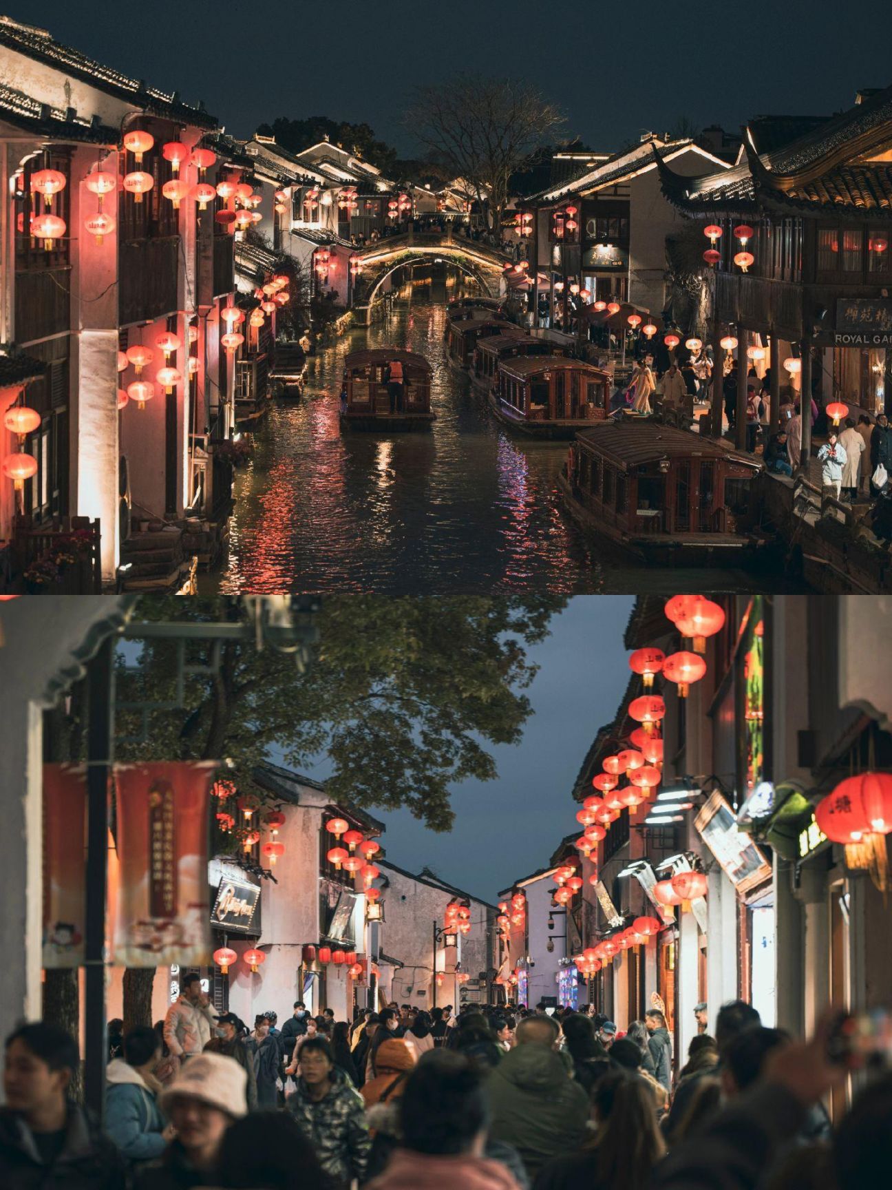 “江南又梦烟雨,步入山塘七里”这里的夜景非常美,白墙黑瓦,桨声灯异,江南之美尽收眼底。