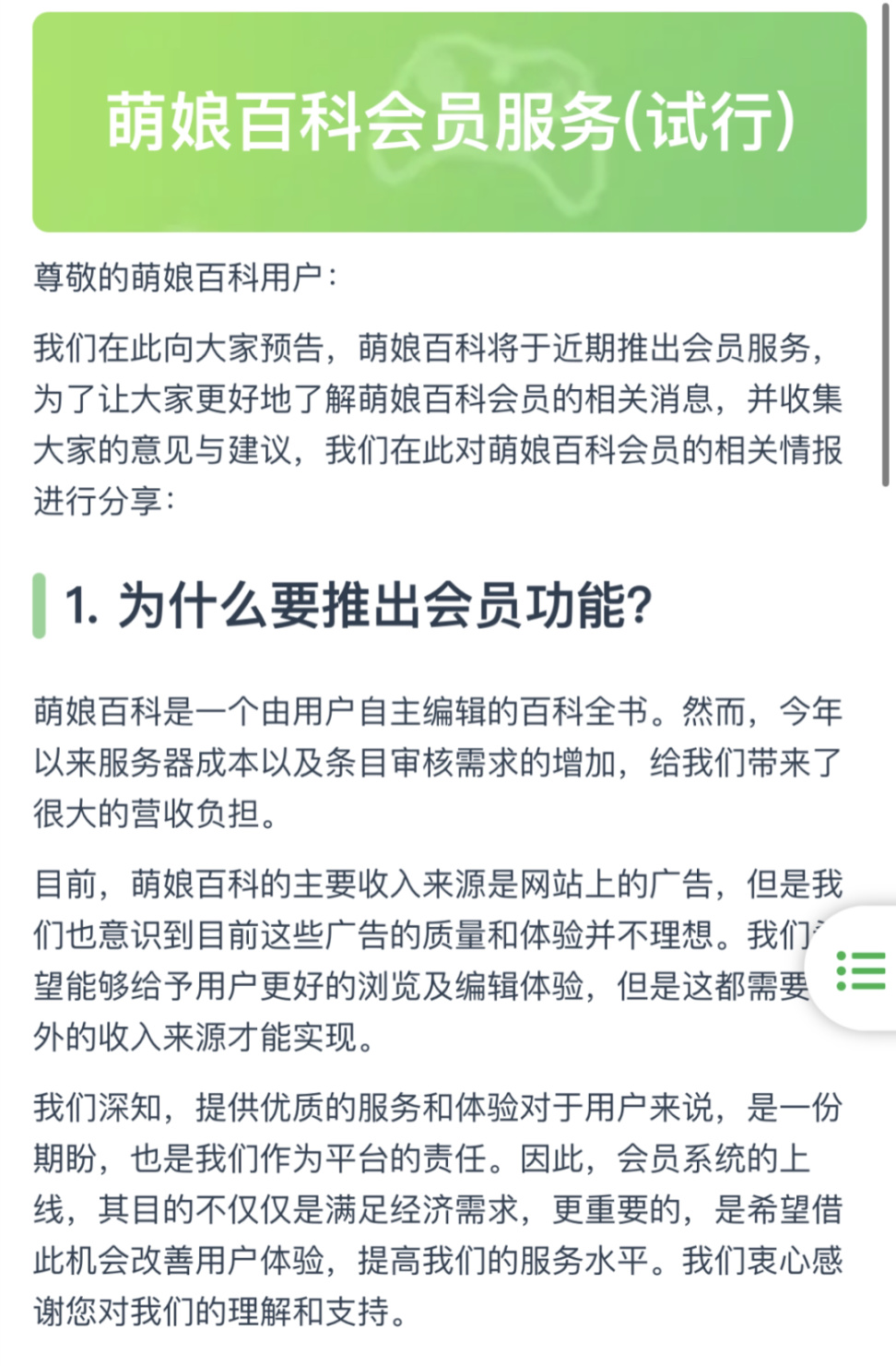 萌娘百科或许知道会员服务会招来一些质疑,但还是这么做了,可能他们也没想出什么别的办法:不这么做,又该怎么盈利呢?