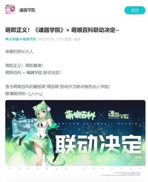 萌娘百科,它是个百科,我们知道百度百科是百度家的,那萌娘百科也不是凭空产生的,它的创始人是Baskice,在2020年被绍兴萌派收购,萌派有个游戏叫《魂器学院》,所以萌百娘和魂器学院联动就十分顺理成章了。