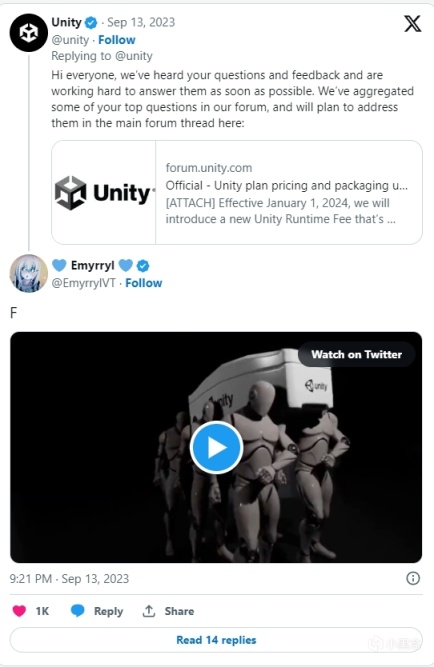 除了被自家员工威胁外,𝕏 上一名Unity 员工Jono Forbes 表示,直到Unity 公开新收费机制前,有大量的员工全部都在反对这一点,大家不断提出自己的观点,公司也告知大家会给个回应,没想到最后公司却毫无预警的宣布了这一结果,许多员工包括该名发文的员工都将离开公司,甚至本周末还会有更多员工选择离职。