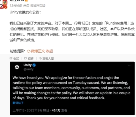 而今日Unity官方表示致歉,對於宣佈的收費條款帶來的混亂深感抱歉,將和客戶、團隊溝通後,近幾日上線新的條例。