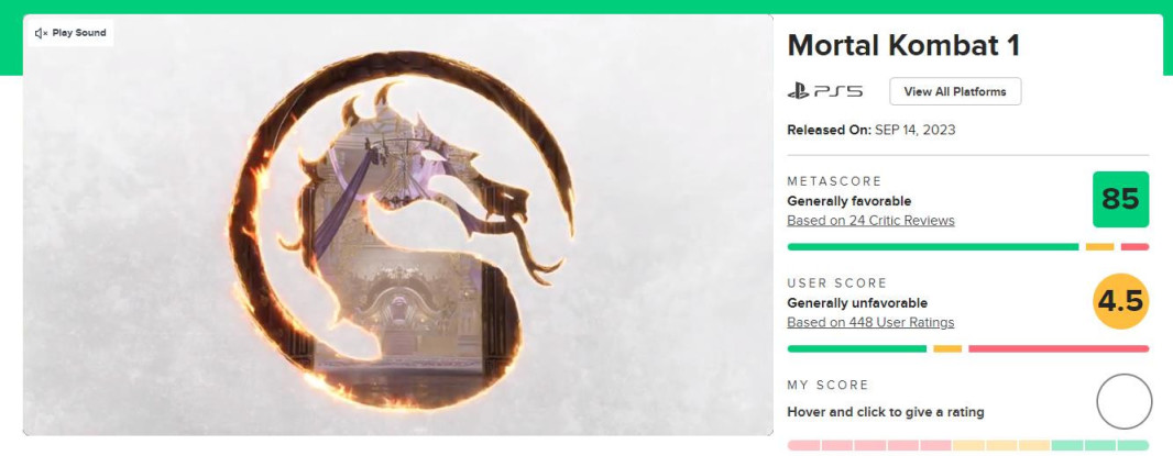 格鬥遊戲《真人快打1》在9月14日開啓了搶先體驗,同時評分網站Metacritic也隨即公佈了遊戲的評分。目前,遊戲已經收到來自24家媒體和448名用戶的評分。媒體綜合評分爲85/100分,而用戶評分爲4.5/10.0分。