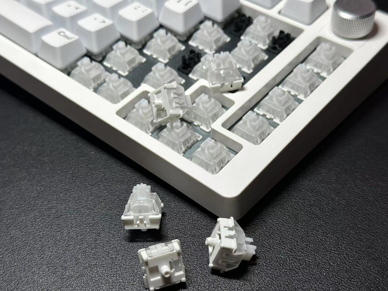 A75這次軸體相比大家都知道,也是衝着這玩意買的。而醉鹿A75的磁軸則是睿翼鯊代工的磁軸,整個軸體外觀和我們平時見到的機械軸體還是非常相似的,但是少了針腳和彈片來進行觸發,而是採用電磁霍爾感應來進行觸發,這樣的好處就在於可以手動的來設置觸發行程,而不像機械軸是固定的觸發行程。