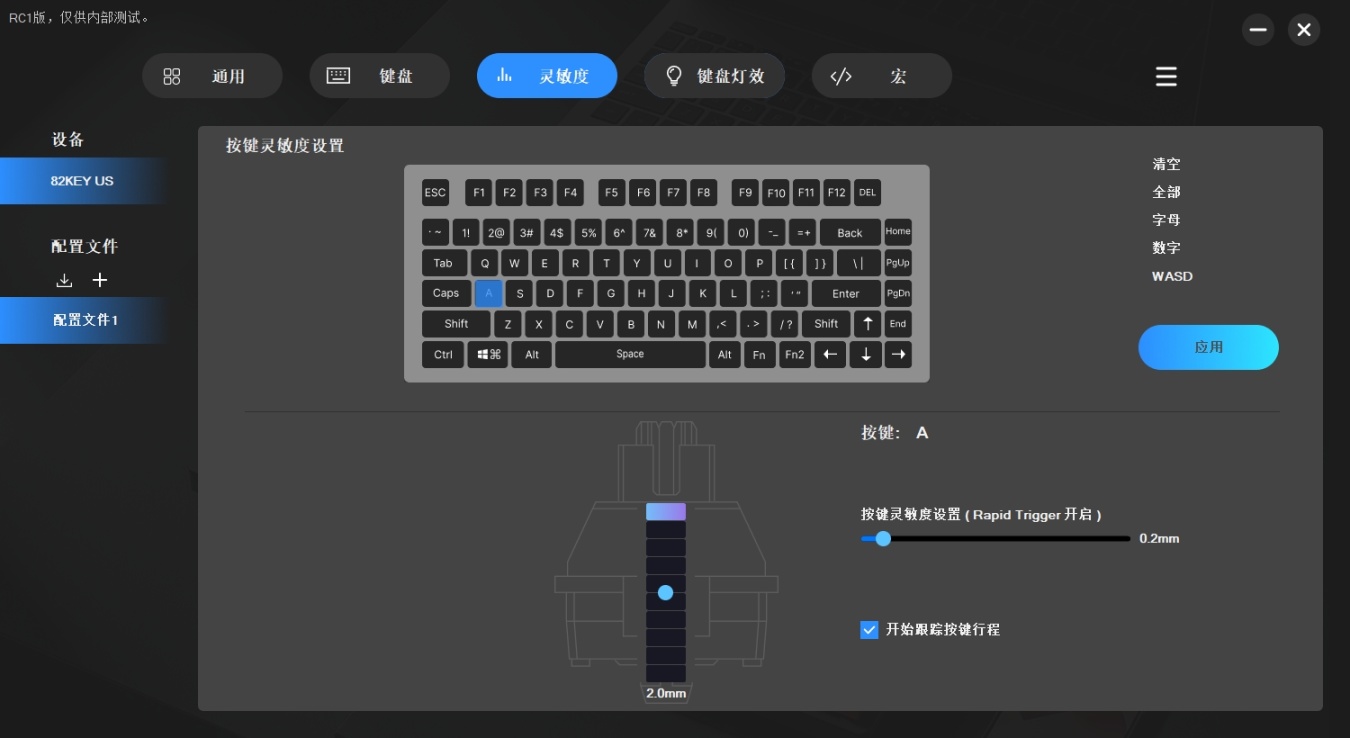 前面按鍵更改和燈光效果這些我就不說了,來說說這個比較火熱的靈敏度設置。第一個是可以設置按下去的靈敏度,最低可以設置到0.4mm這就很誇張了,基本上輕點一下直接就觸發了,這是傳統機械軸達不到的水平。而他不僅可以設置觸發行程,他還可以設置回彈行程,最低0.2mm,什麼意思呢?相比傳統機械軸你按下去,然後要等整個軸體回到原位纔算一次。而磁軸是當你設置到0.2mm時,你按下不需要等待軸體完全回彈纔算一次,而是在回彈到原位的過程中的0.2mm就可以算一次回彈了。
